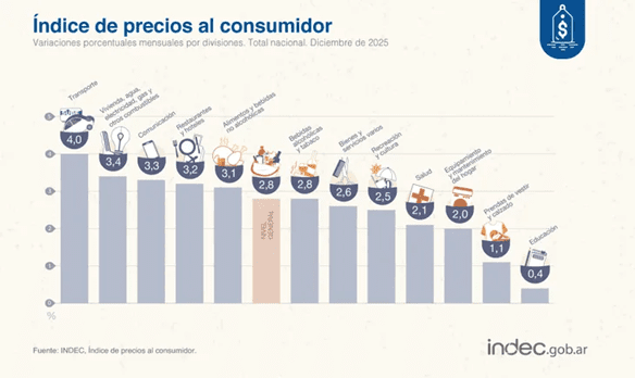 La inflación de diciembre se aceleró 2,8% impulsada por el rubro de alimentos y bebidas, que trepó 3,1% y se convirtió en la división con mayor incidencia en el índice; pero pese a este repunte de fin de año, 2025 cerró con una variación acumulada del 31,5%, consolidándose como la cifra más baja desde 2017.