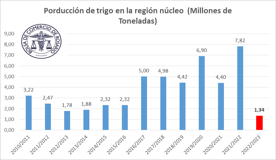El rinde también se ajusta de 18qq/ha de promedio a 15 quintales. Hay que recordar que el rinde promedio de la región es de 39 a 40 qq/ha. Y que el rinde más bajo de la región, el del ciclo 2020/21, fue de 29 quintales, casi el doble de esta campaña.