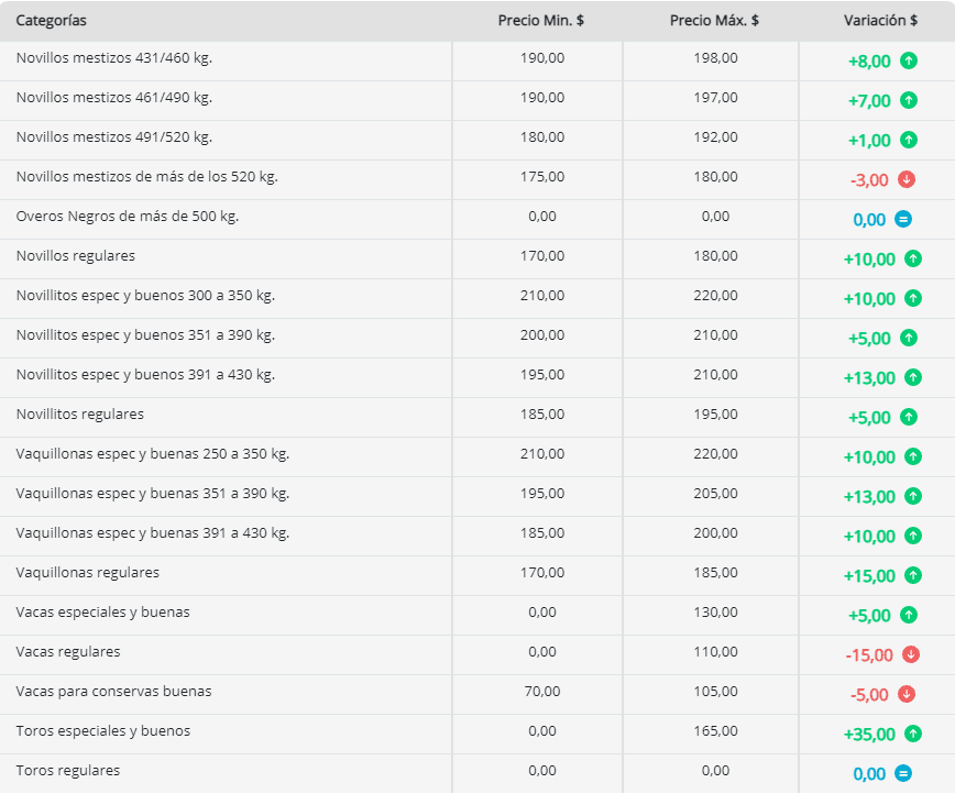 Para el caso de la vaquillona, el cierre de hoy marcó un precio promedio de 199,60 $/kg, que comparado al precio promedio de la semana pasada aumentó del 7,9%, y respecto a la cotización del martes, elevó su valor en 10,8%.