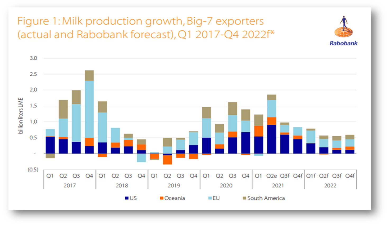 Rabobank proyectó para Argentina “un crecimiento general de la producción de leche de alrededor del 2% en 2021, en comparación con 2020 con un segundo semestre de 2021 mucho más débil”.