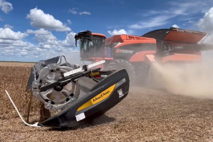 El equipo fue probado en la recolección de soja en Brasil, complementado con un cabezal MacDon de 50 pies.